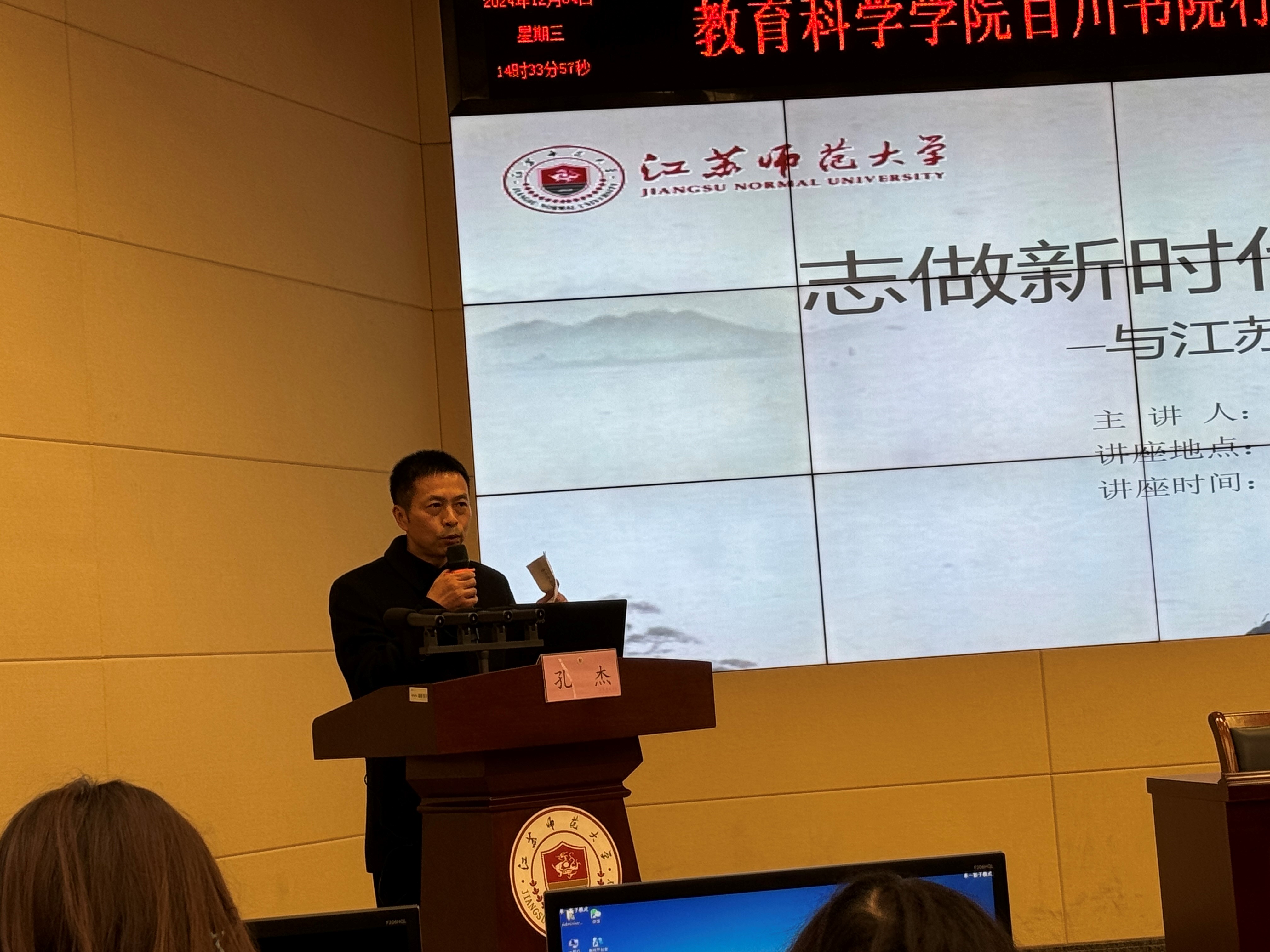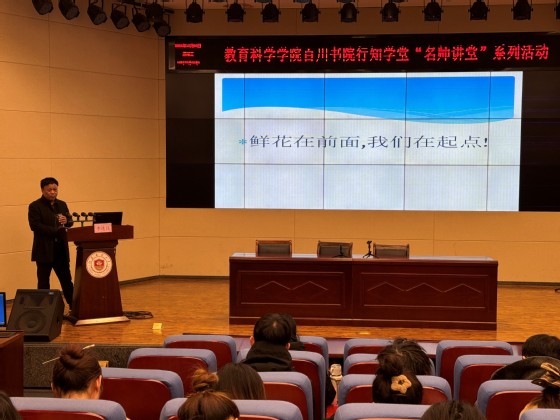 12月4日14:30,徐州市教育局教师工作处李进强处长应邀参加我院百川书院行知学堂“名师讲堂”系列活动,为我院学生作题为“志做新时代的教育家”专题讲座。本次讲座在13号楼106报告厅举行,由江苏师范大学教育科学学院孔杰老师主持,我院部分教育硕士参加。